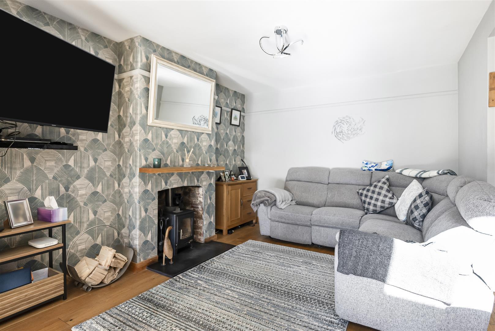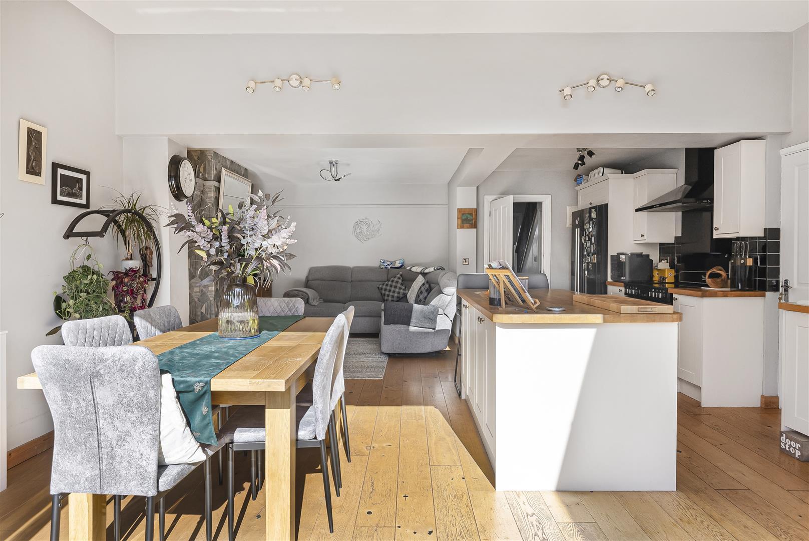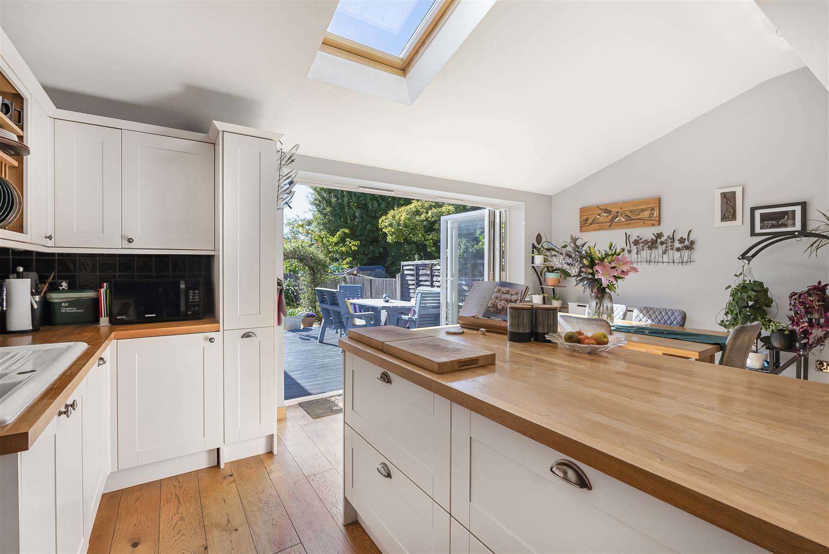 The family area has a wood burning stove and plenty of space for sofas. Bi-folding doors open onto the South facing rear garden.