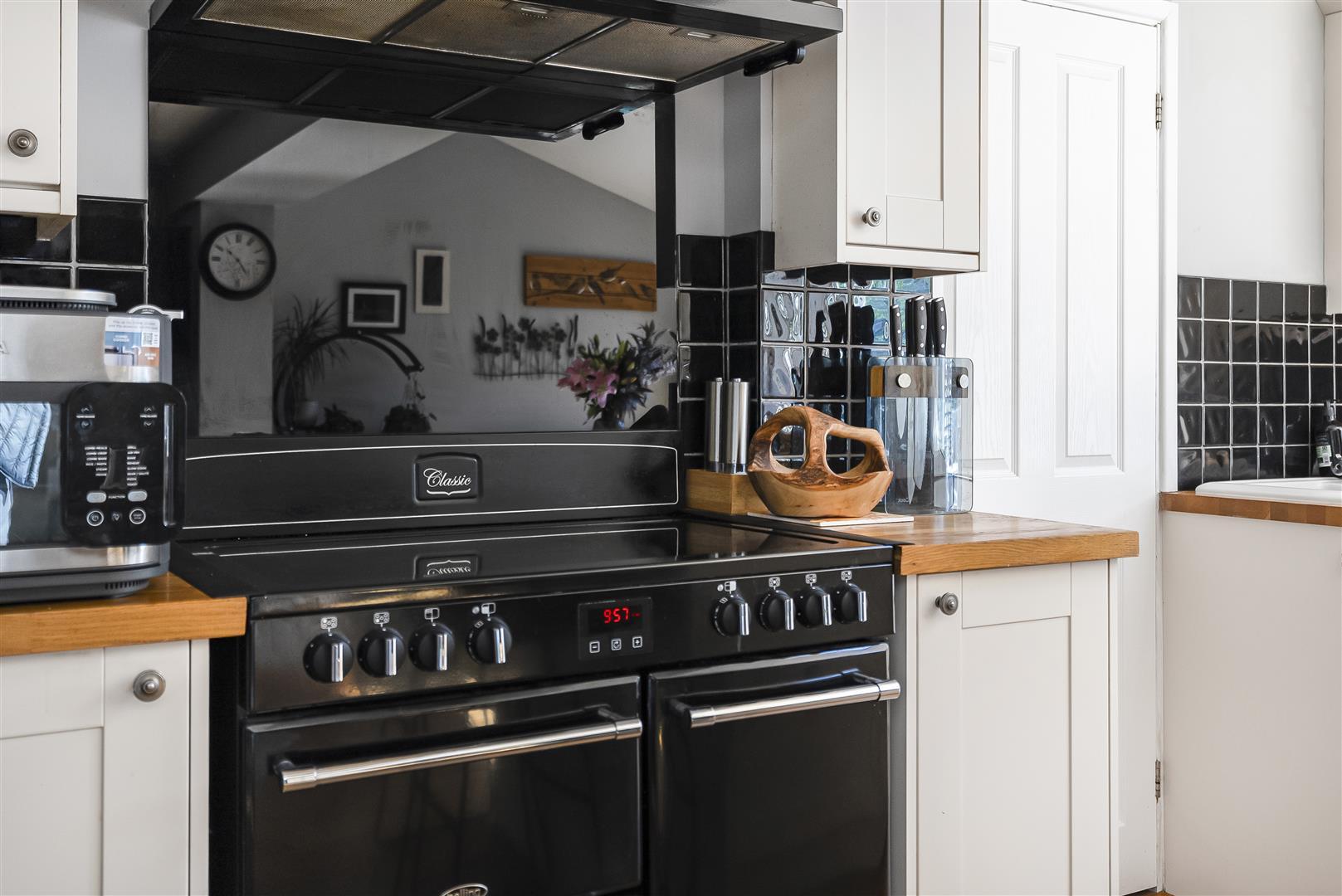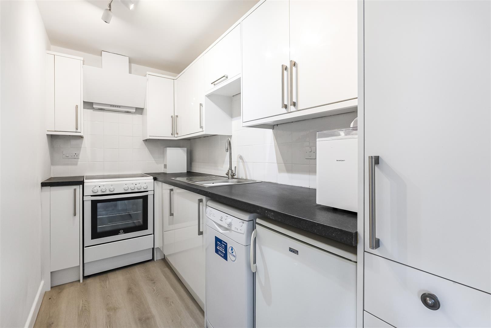 Fitted kitchen with wall and base units, cooker with extractor over, space for slimline dishwasher and space for fridge.