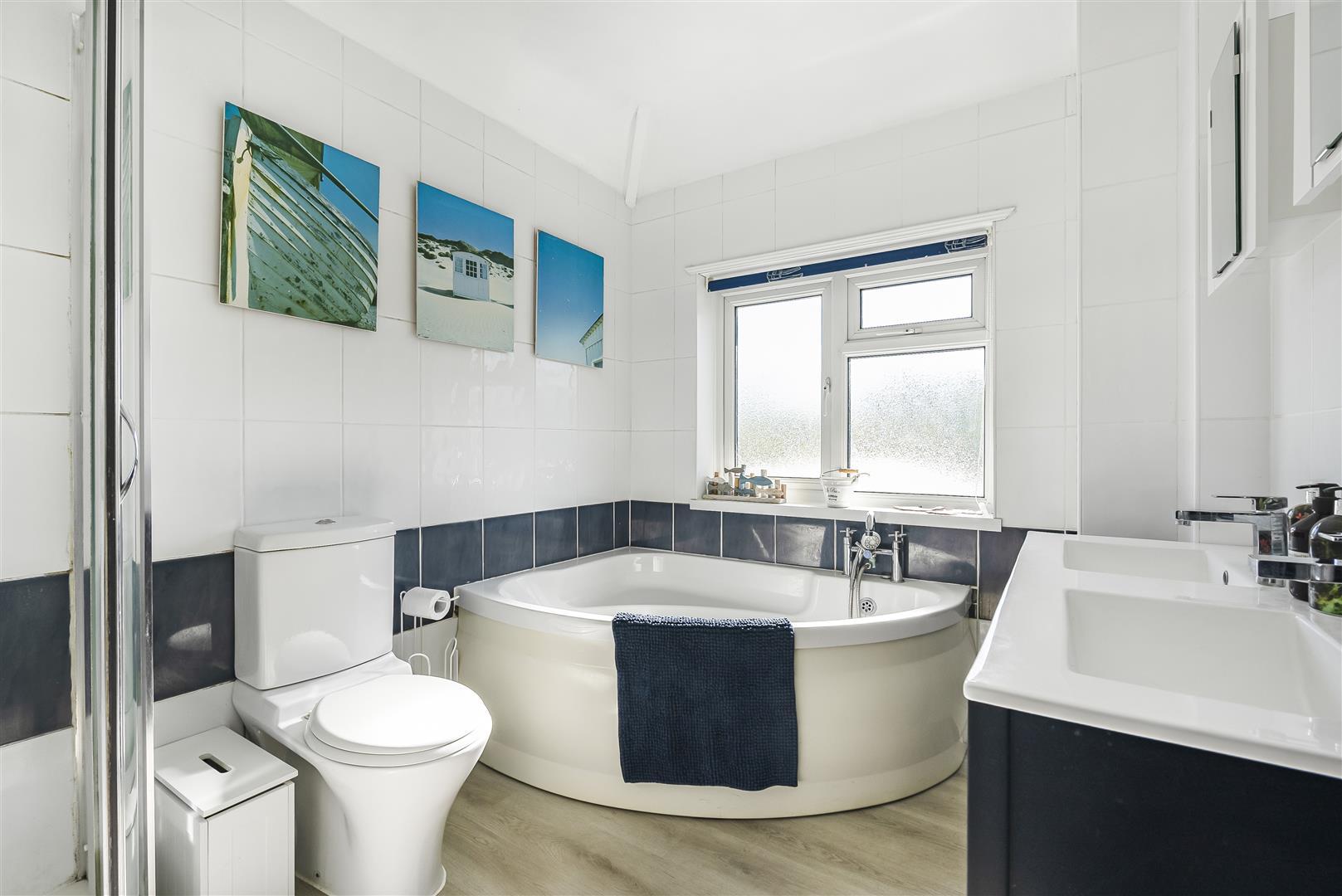 Spacious and fully tiled bathroom with bath and separate shower, twin basins, WC, window to the rear.