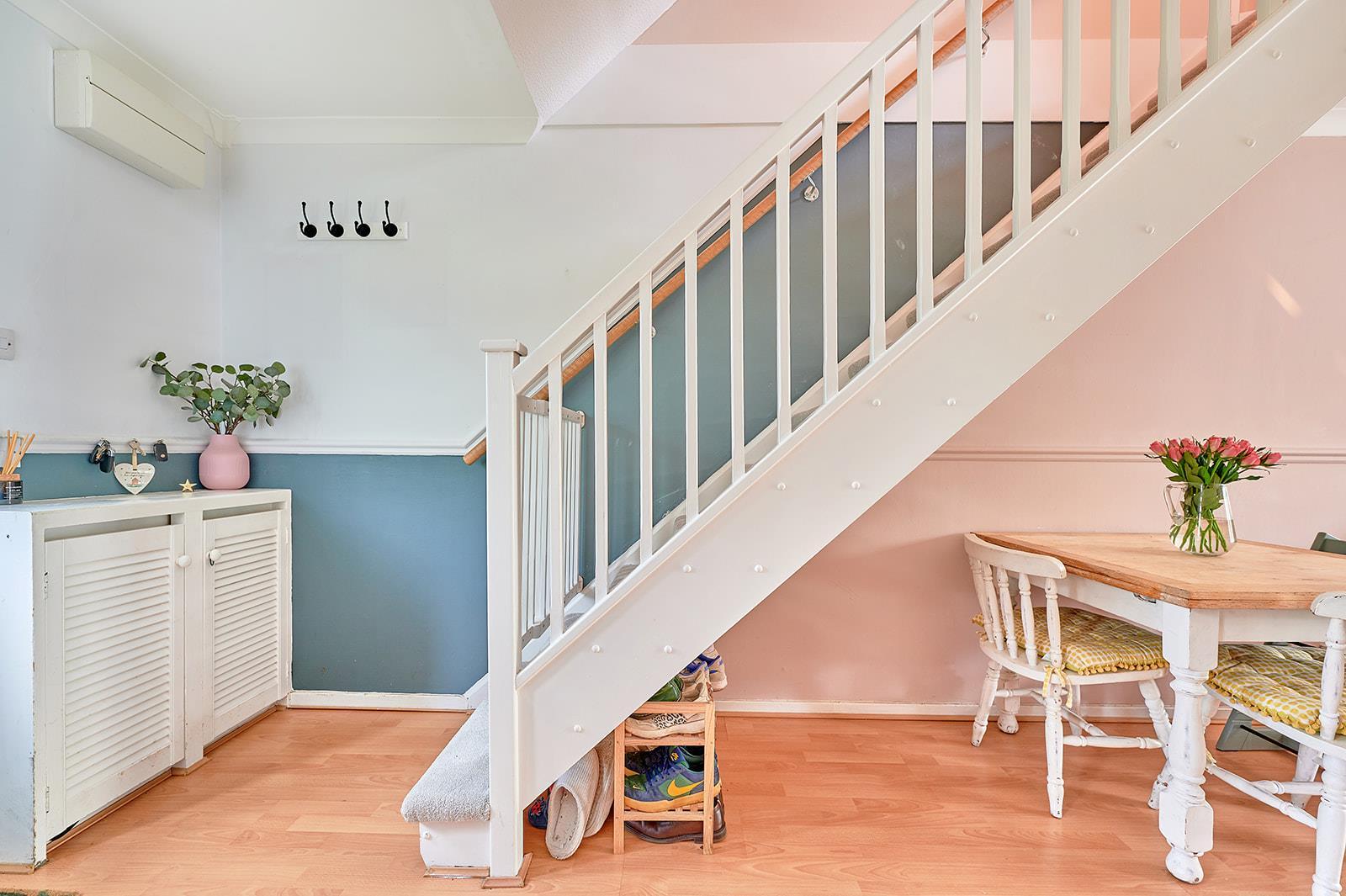 With stairs to the first floor, opening to the kitchen and open plan to the sitting/dining room.