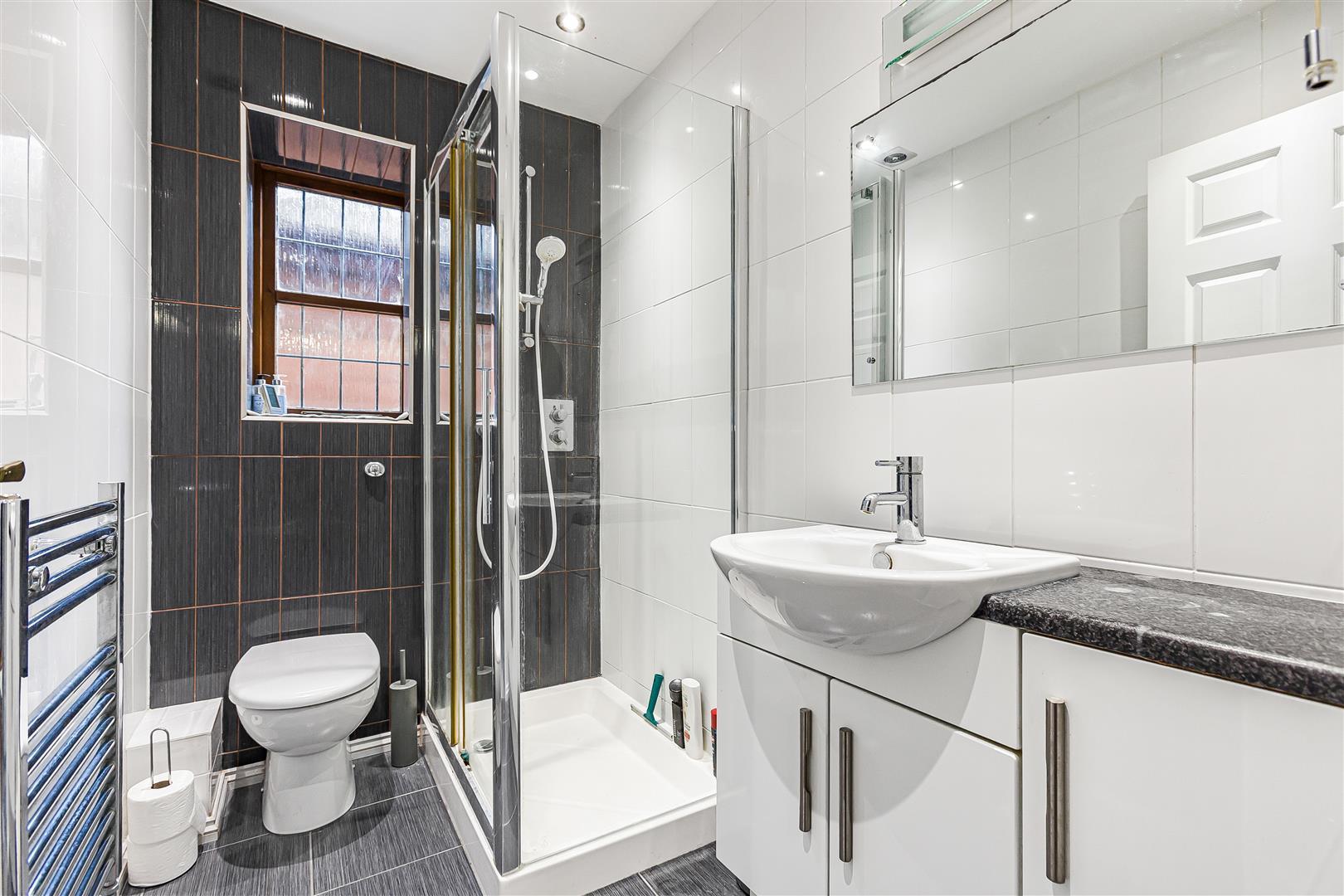 Refitted with WC, basin with vanity unit and heated towel rail.