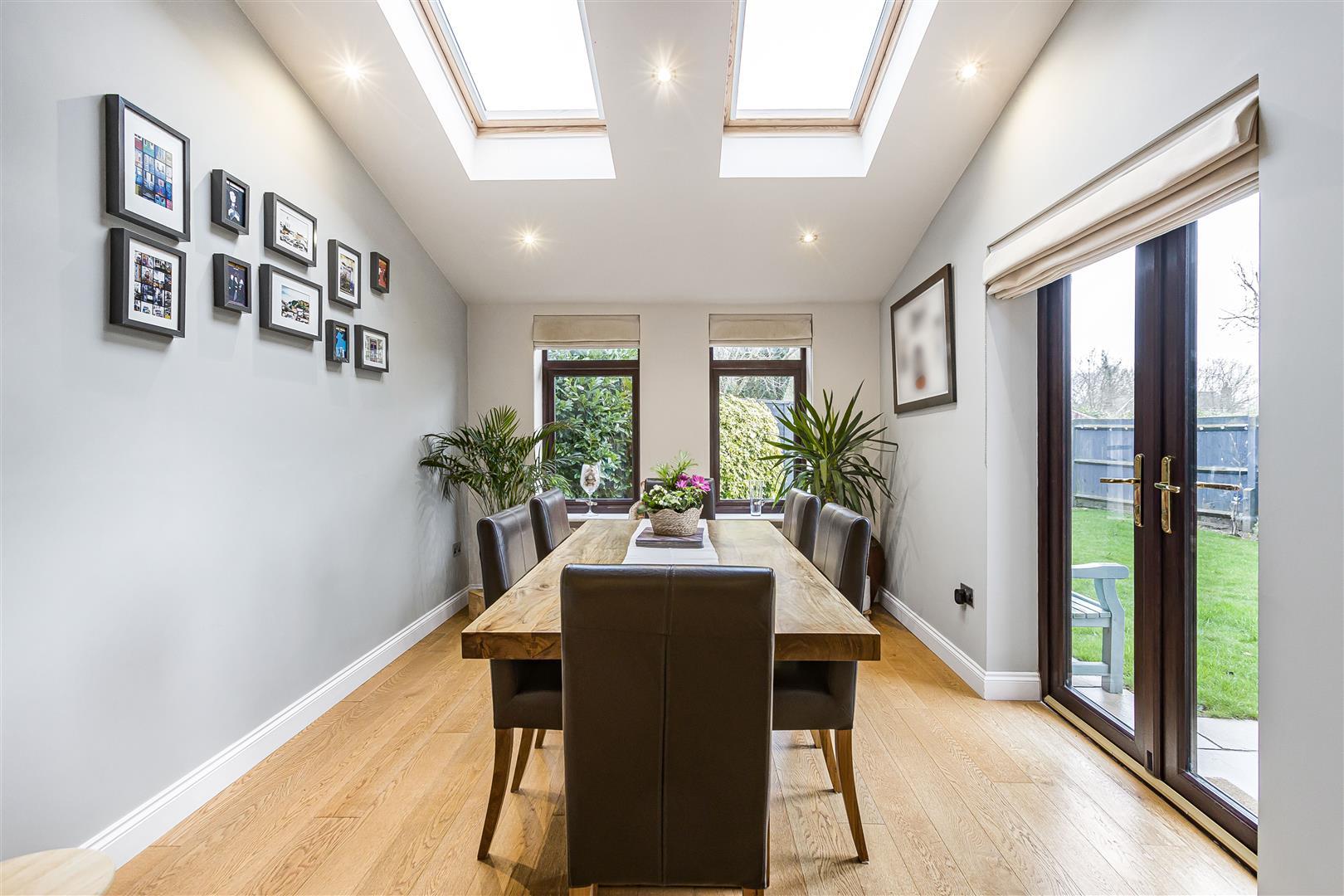 Bright and airy room with two skylight double glazed windows fitted with solar powered blinds, double doors opening onto the rear garden.