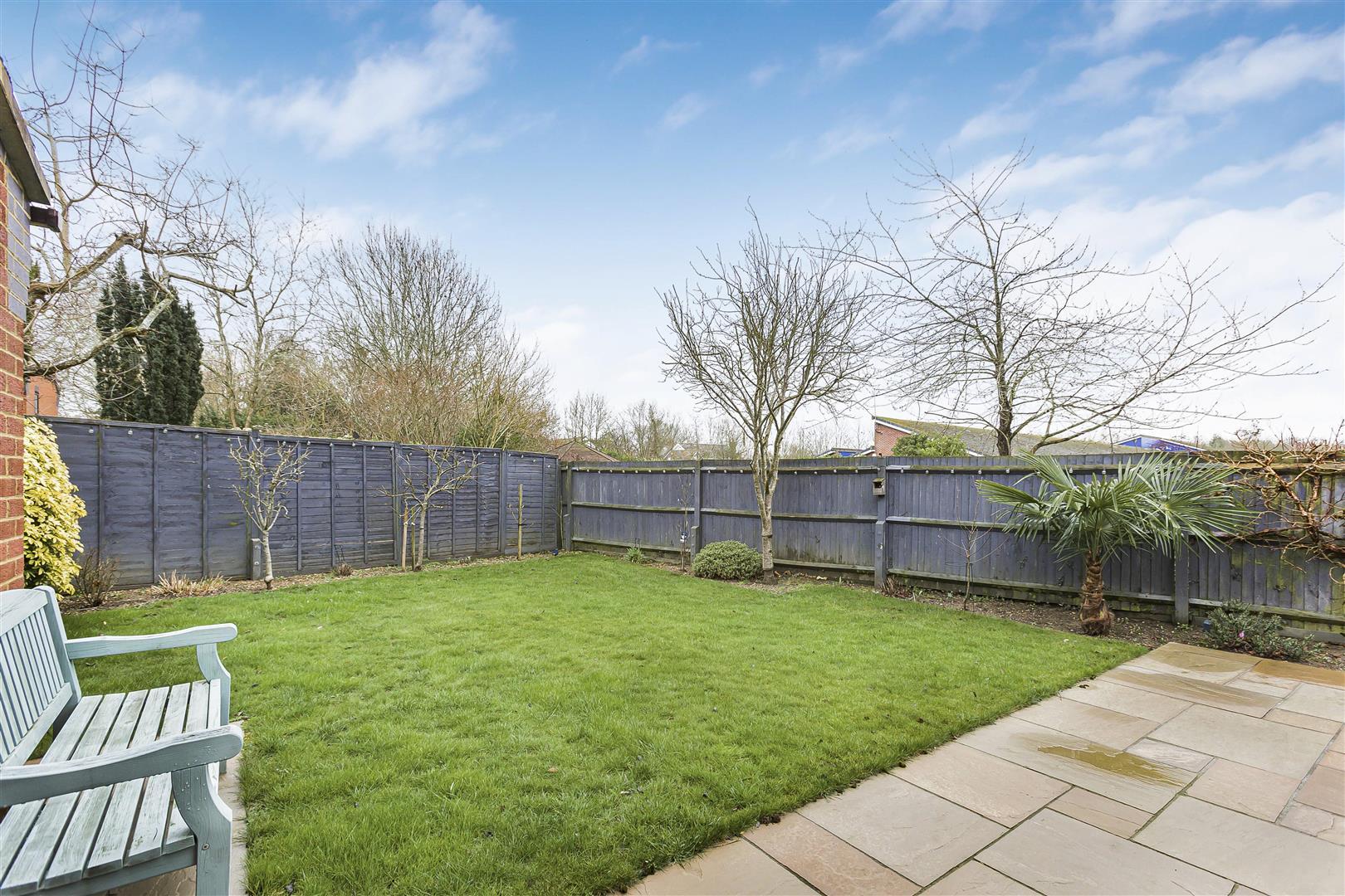 Attractive garden with mature Plum, Apple and Cherry trees, remote controlled lighting, a large sandstone patio and shed with power.