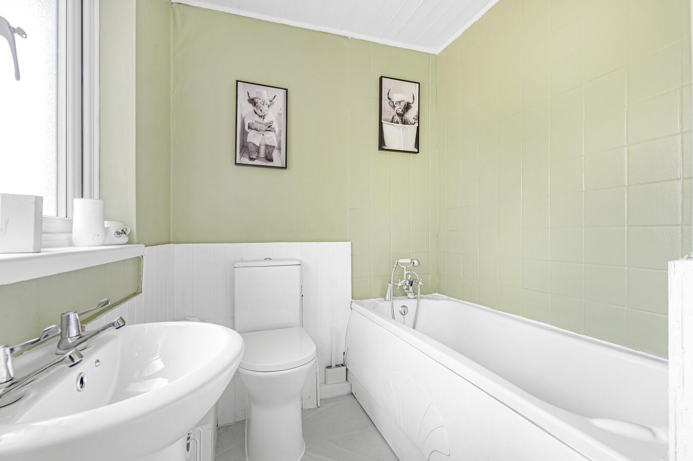 Double glazed window to the rear aspect. Ceramic tiled floor with underfloor heating. Pedestal wash basin. Low level WC. Panel bath with mixer tap and shower attachment.