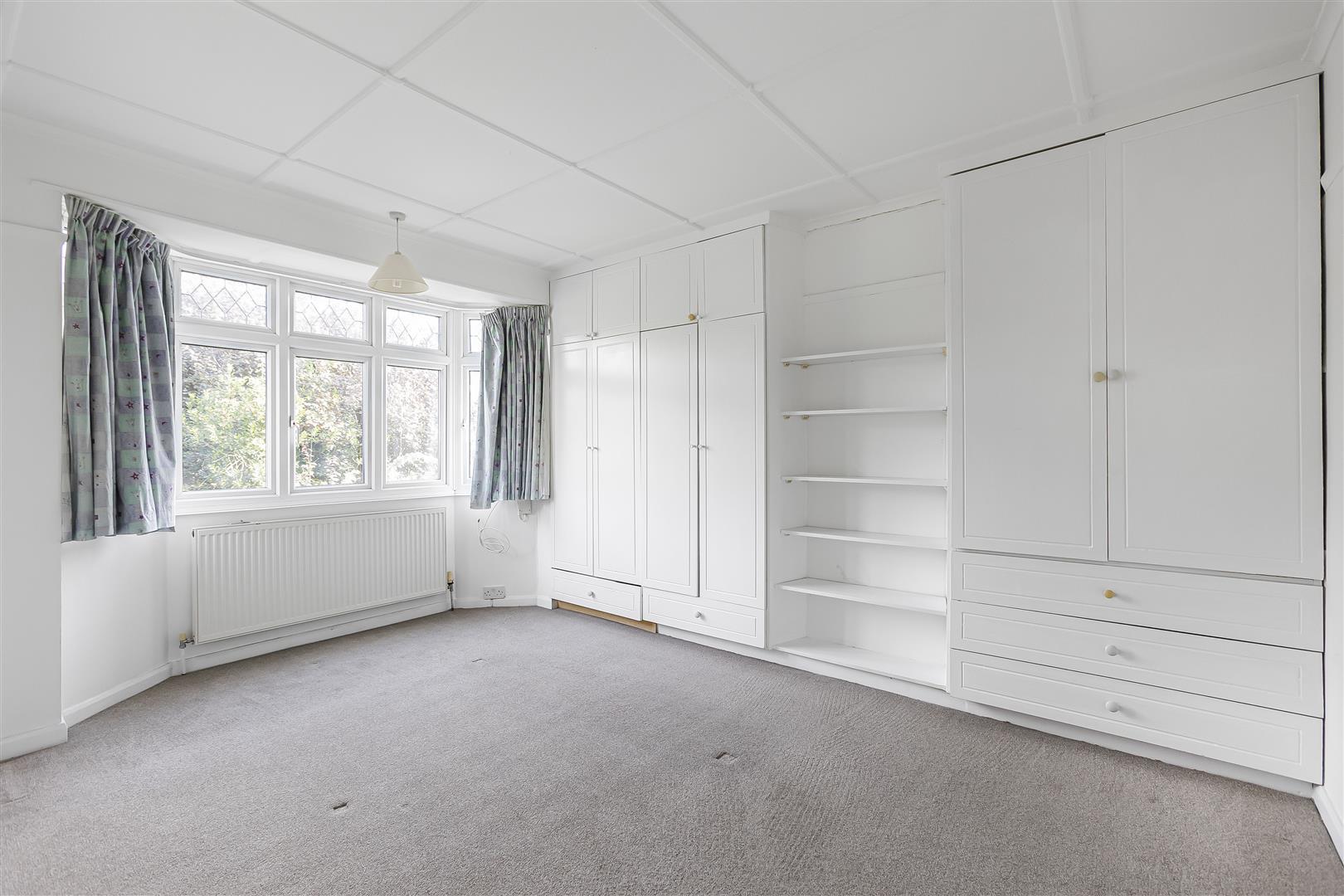 Spacious front reception room with large bay window, radiator, fitted cupboards and shelving.