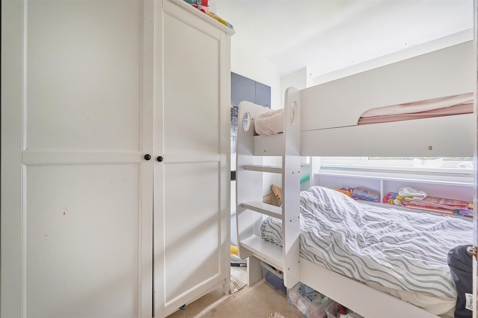 Large built in wardrobe with full-height sliding mirror doors. Two double glazed windows to the front aspect. Bulkhead storage cupboard. Radiator. Wooden floor.