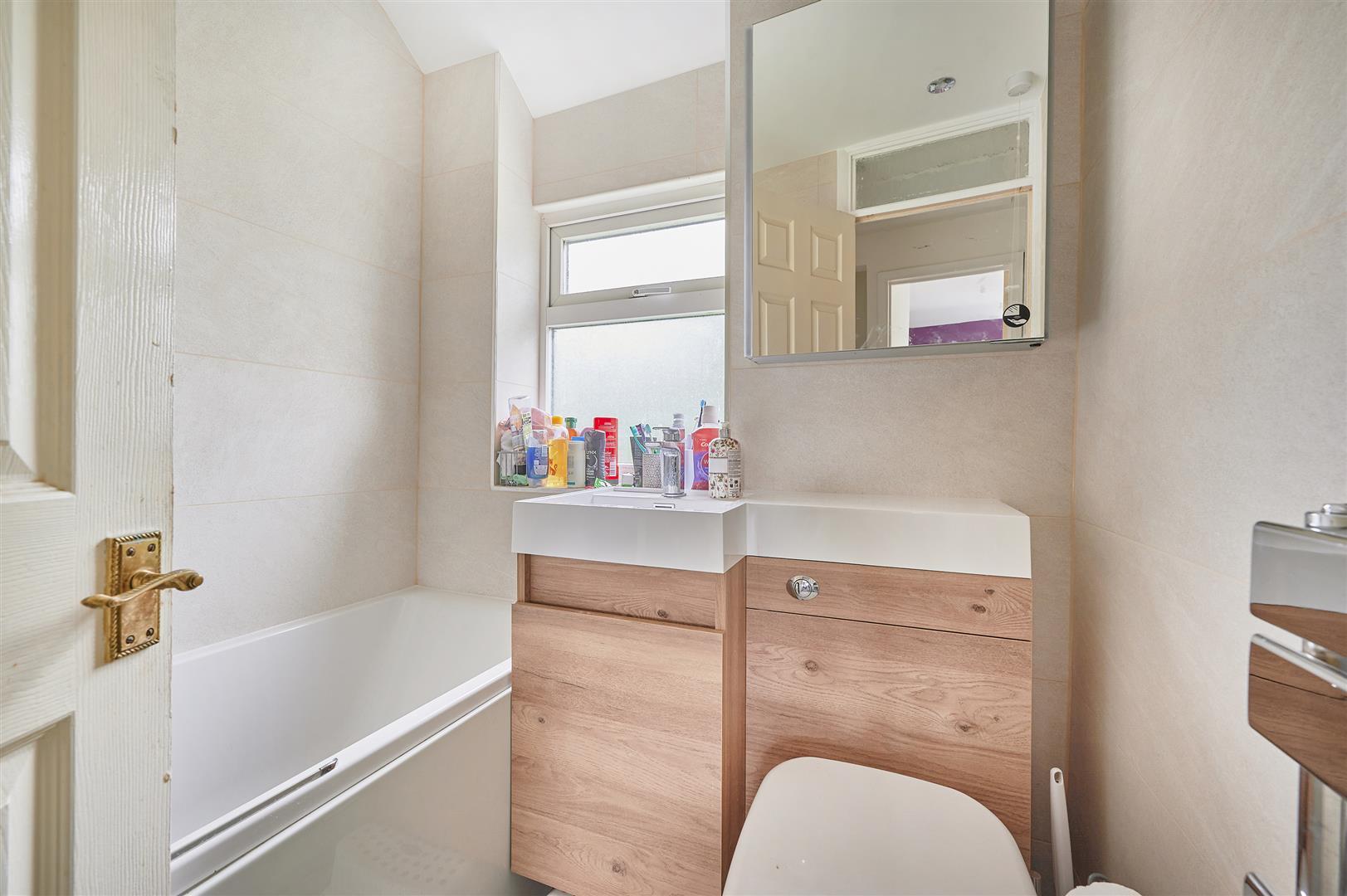 Vanity unit wash basin with mixer tap and cupboard below. Adjacent WC with concealed cistern. Chrome heated towel rail. Panel bath with overhead 'rain forest' shower and hand-held attachment. Double glazed window to the rear aspect.