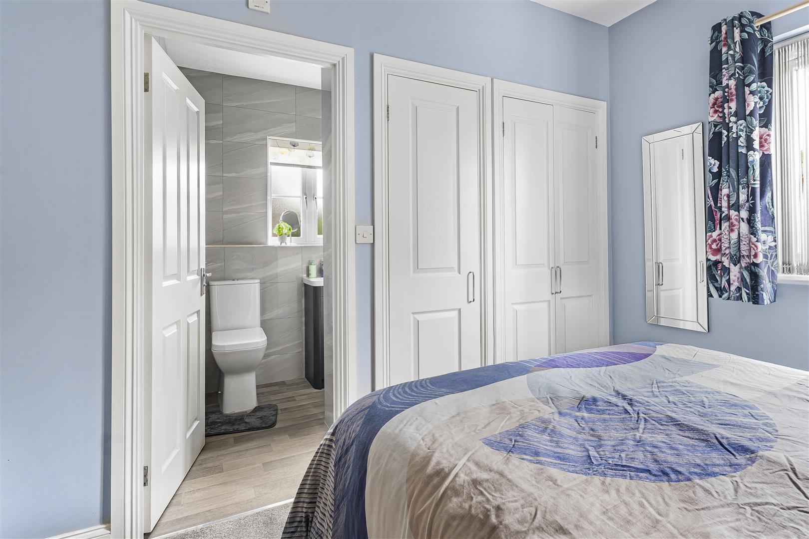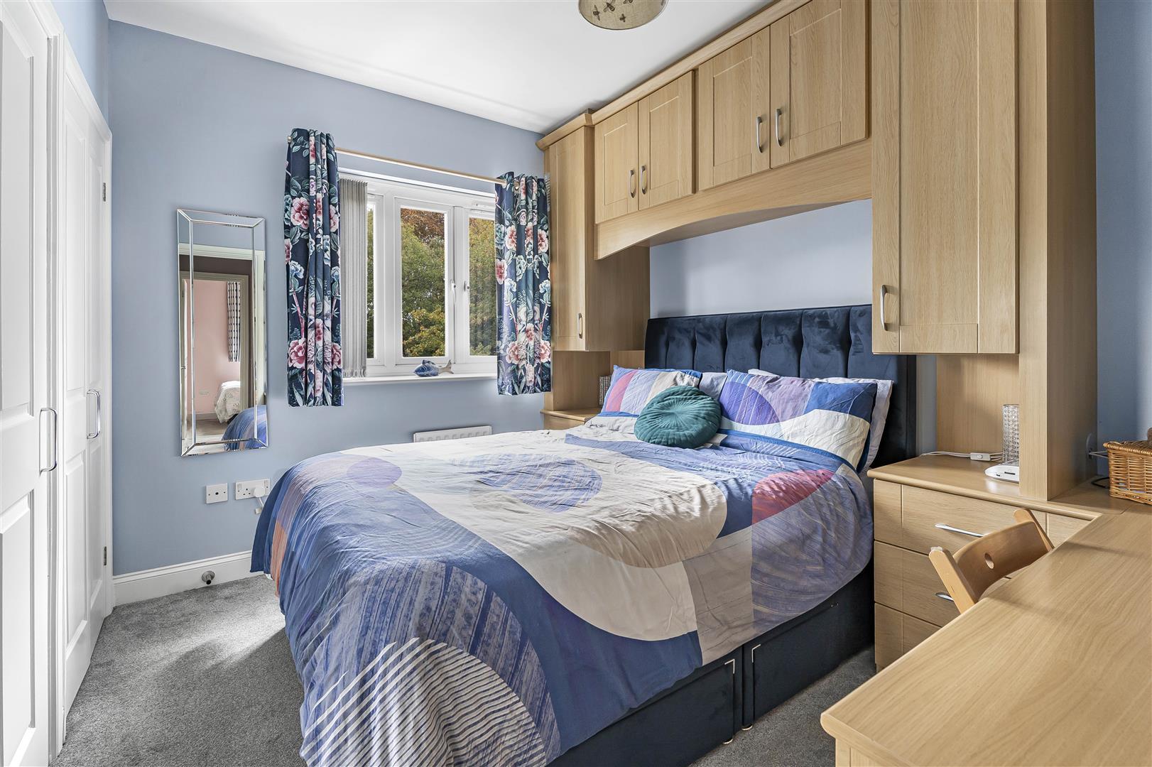 Double bedroom with fitted dressing table and cupboards, built in wardrobes and window to the front.