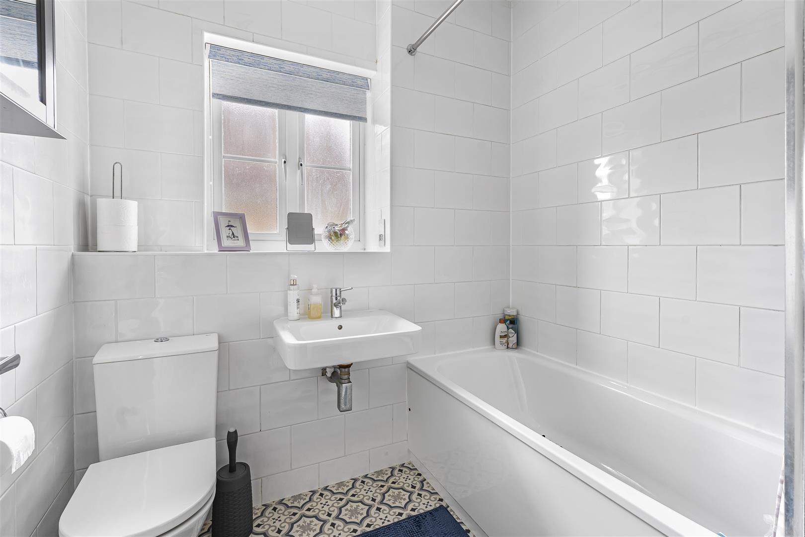 Fully tiled room with window to the side, basin, WC and bath with digital Aqualisa shower over.