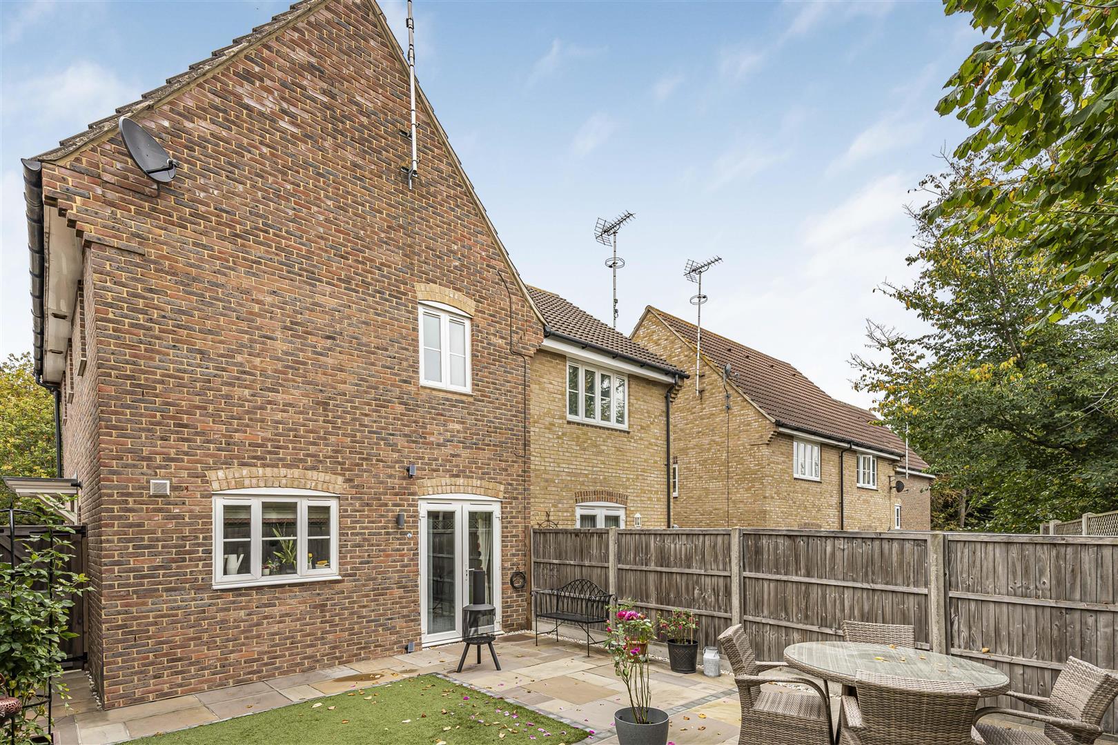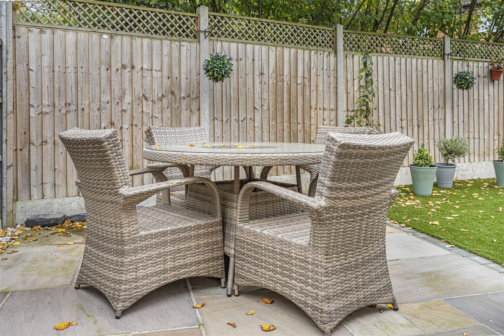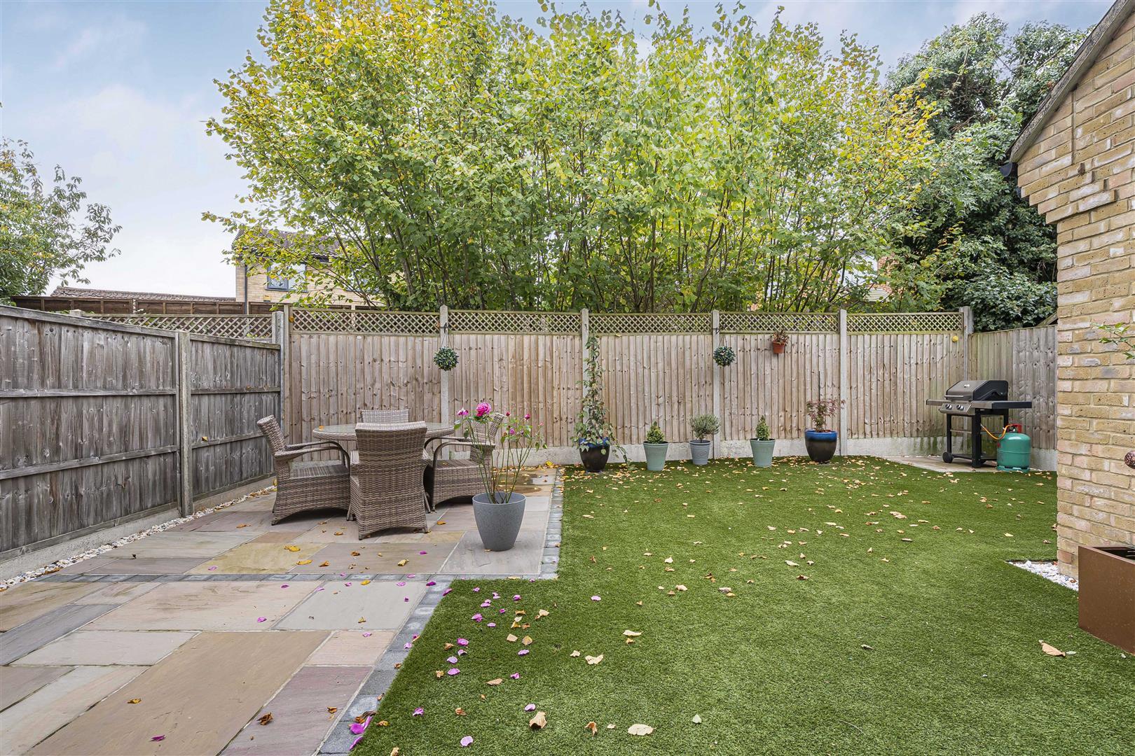 Professionally landscaped South West facing rear garden with a large patio and astroturf lawn. There is an outside tap, gated side access leading to the driveway and access to the rear of the garage.