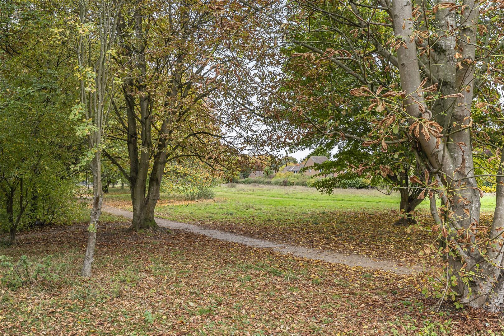 View across Thorley Wedge Park and Play Area with footpaths leading to the town centre.