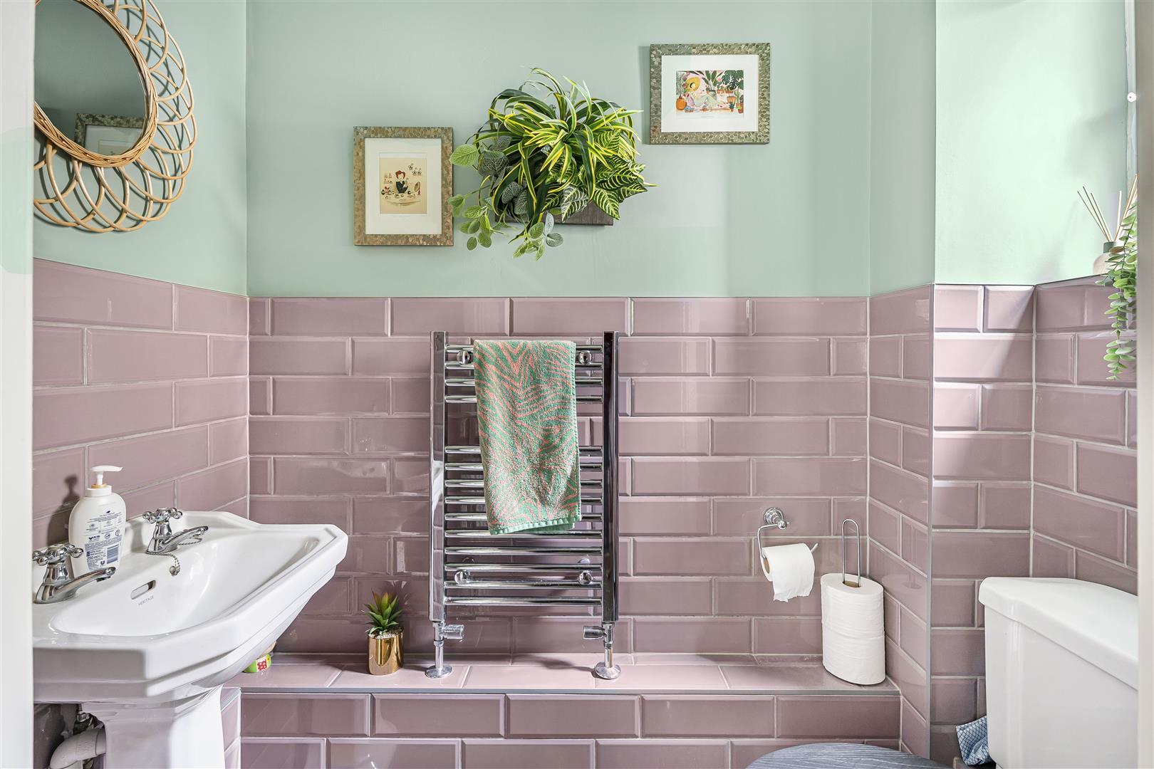 Modern fully tiled room with window to the side, WC, basin with vanity unit, shower with wall mounted digital Aqualisa shower and stainless steel heated towel rail.