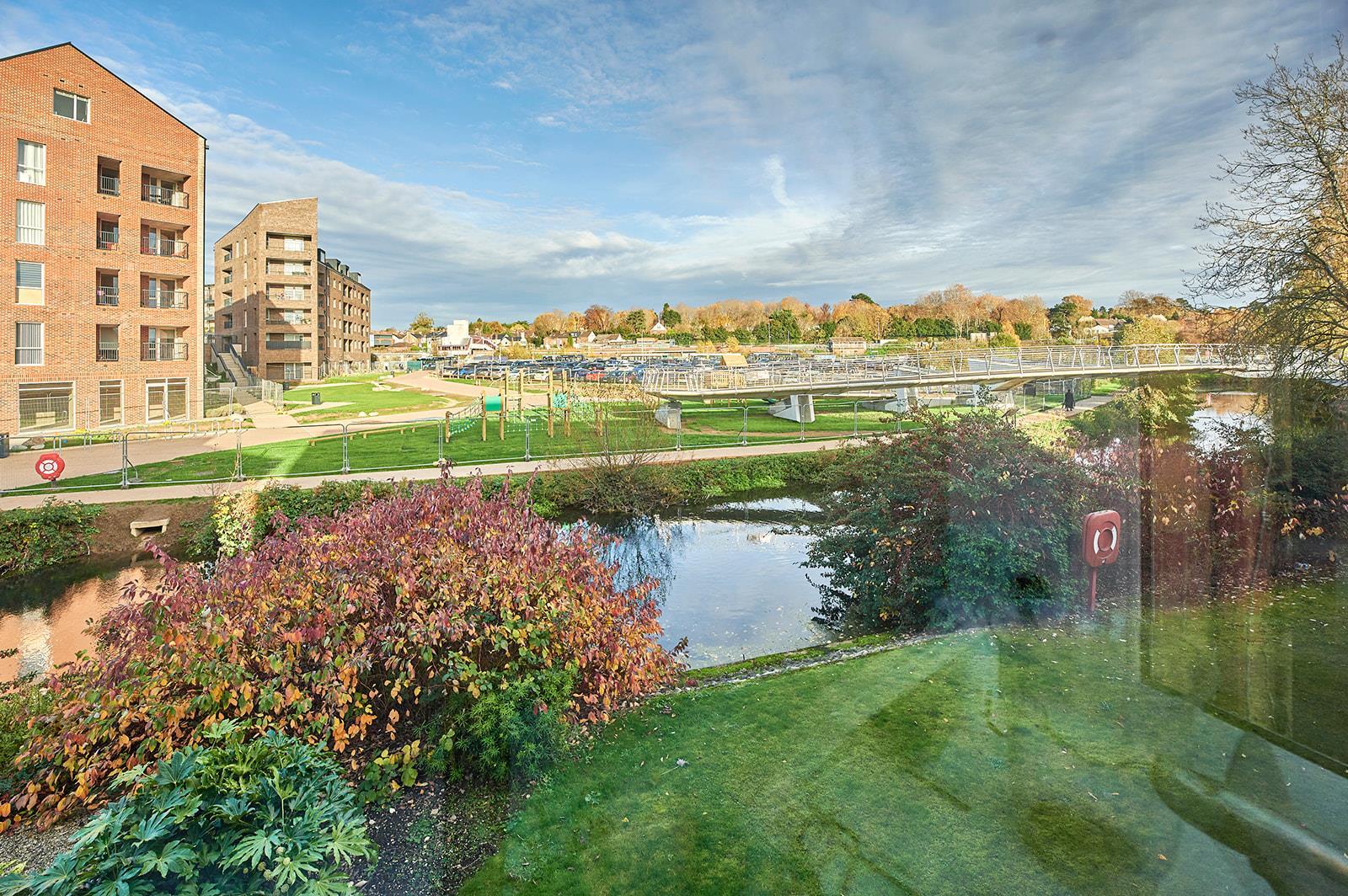 Modern and bright open plan living area with a large bay window overlooking the river and gardens. This sociable space includes a high specification fitted kitchen, dining area and sitting area. There is underfloor heating throughout and the kitchen includes;