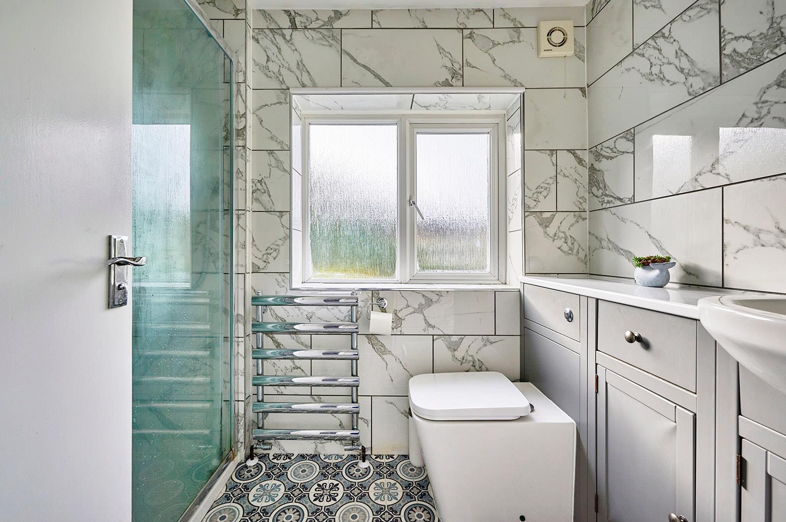 Fully tiled bathroom with bath, basin, WC and stainless steel heated towel rail.