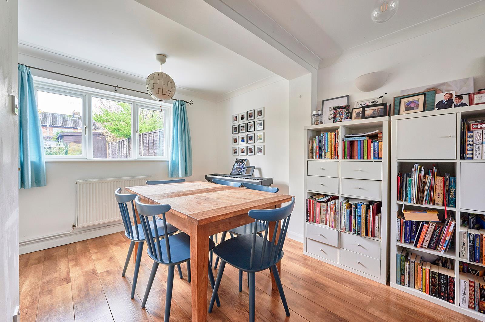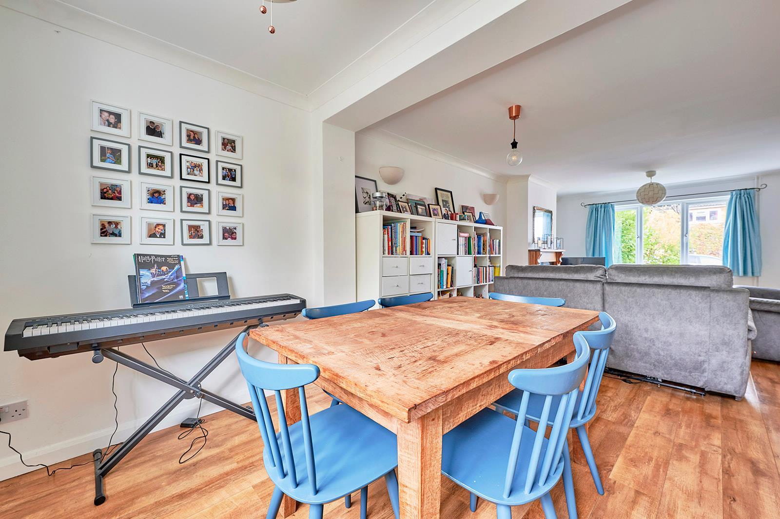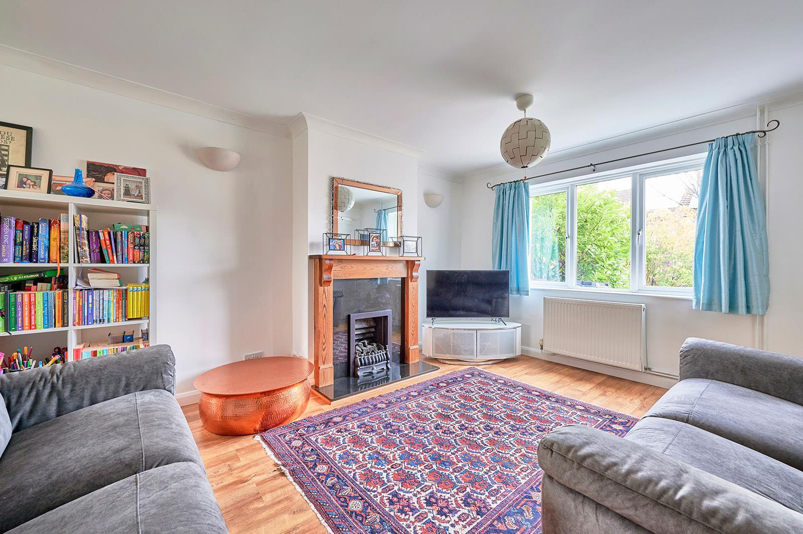 Large and bright open plan living space with fireplace and gas fire, large windows to the front and rear and under stairs storage cupboard.
