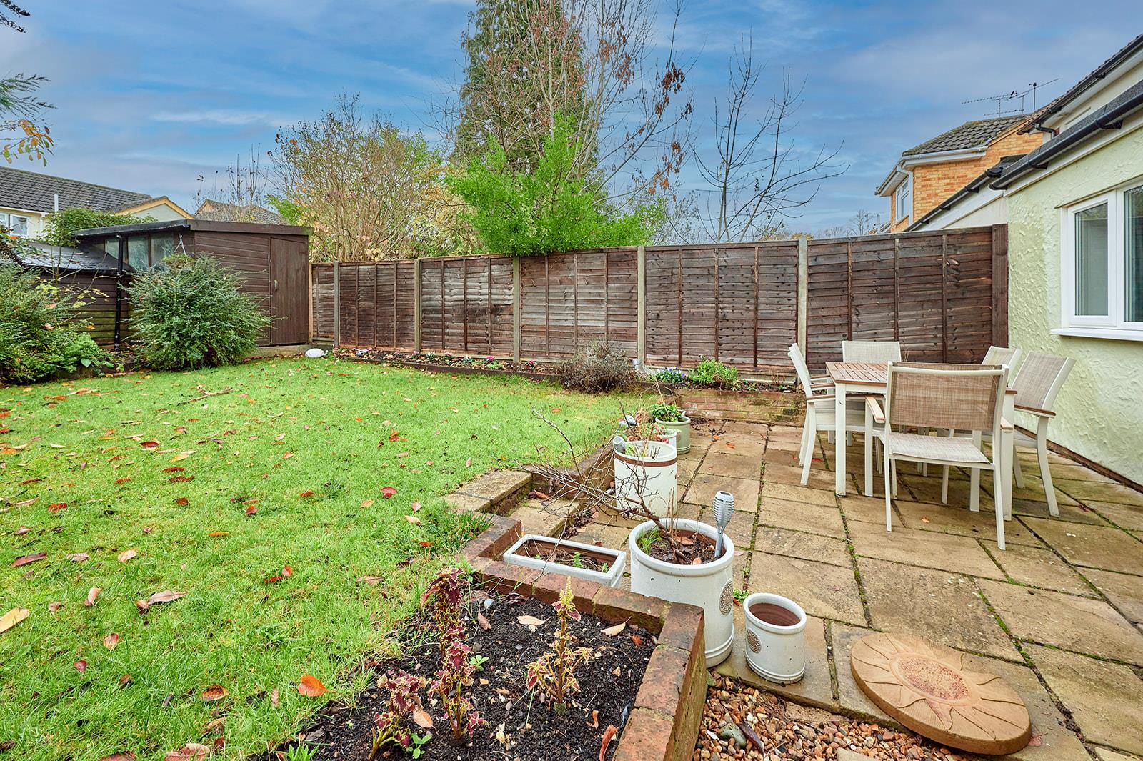 South facing garden mostly laid to lawn with a patio, shed (which had a new roof in 2020) and established trees and shrubs to the boundaries.