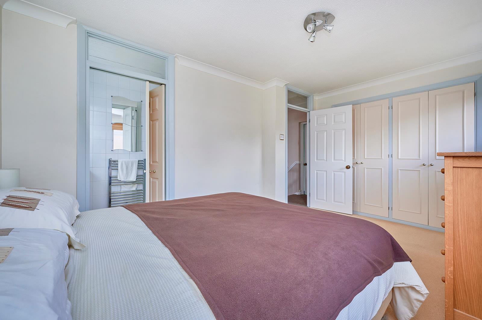 Large double bedroom with fitted wardrobes and door to;