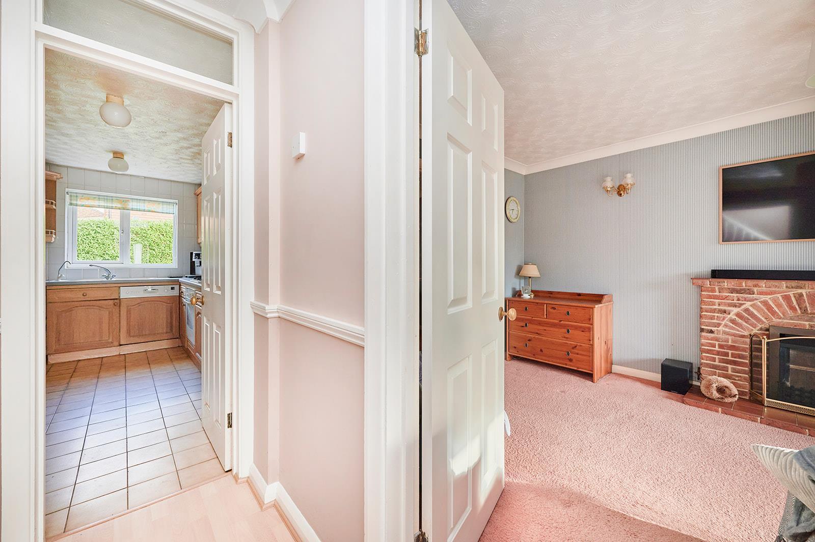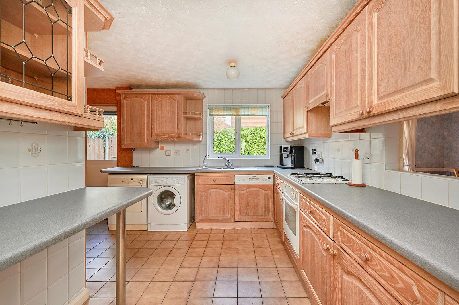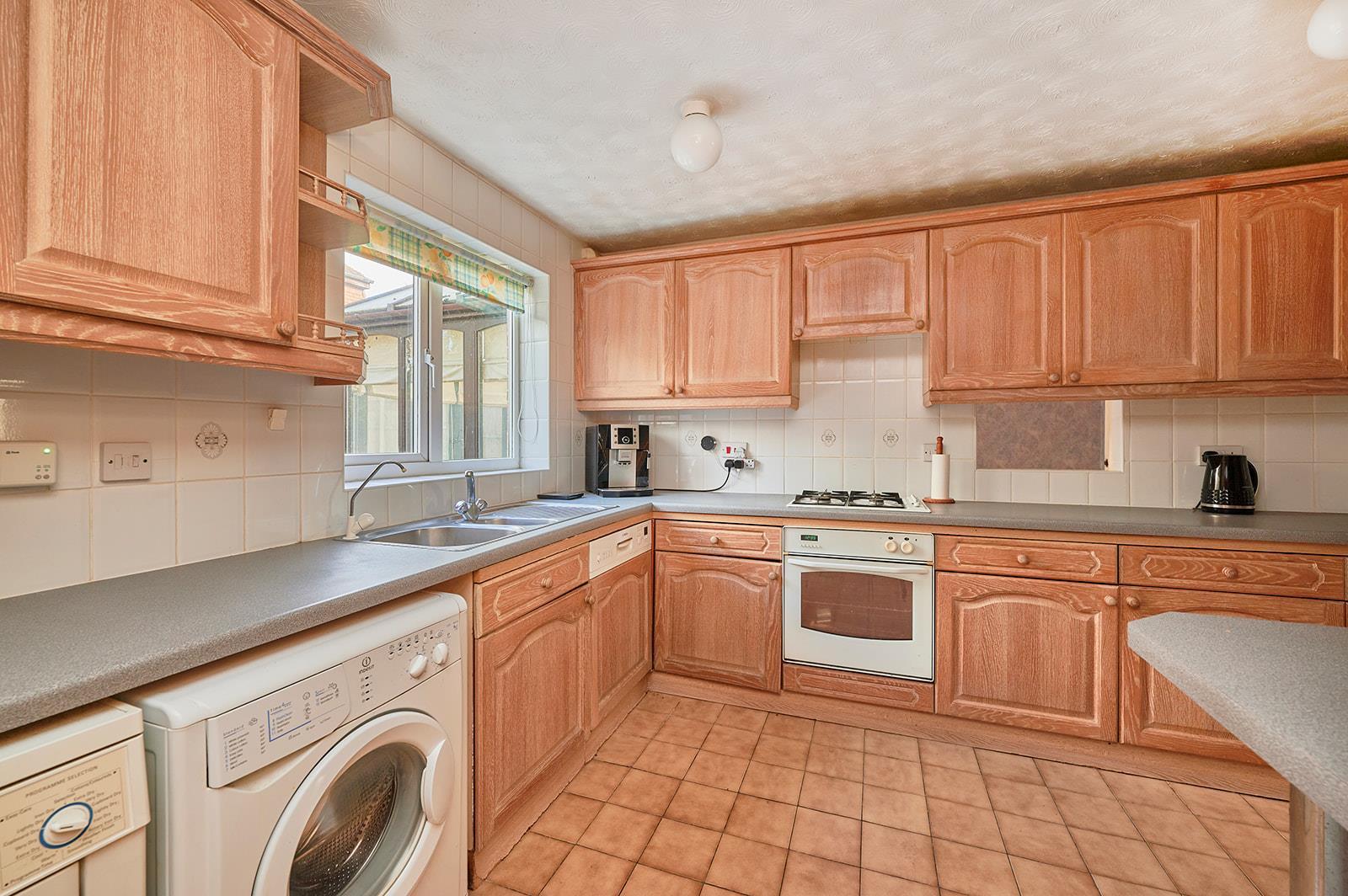 Fitted wall and base units, integrated electric oven with gas hob over, space for washing machine, space for tumble dryer, doors to rear garden and integral garage.