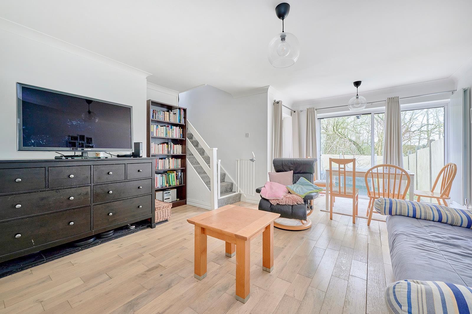 Large and bright reception room with a fireplace and door to the rear garden, stairs to the first floor.