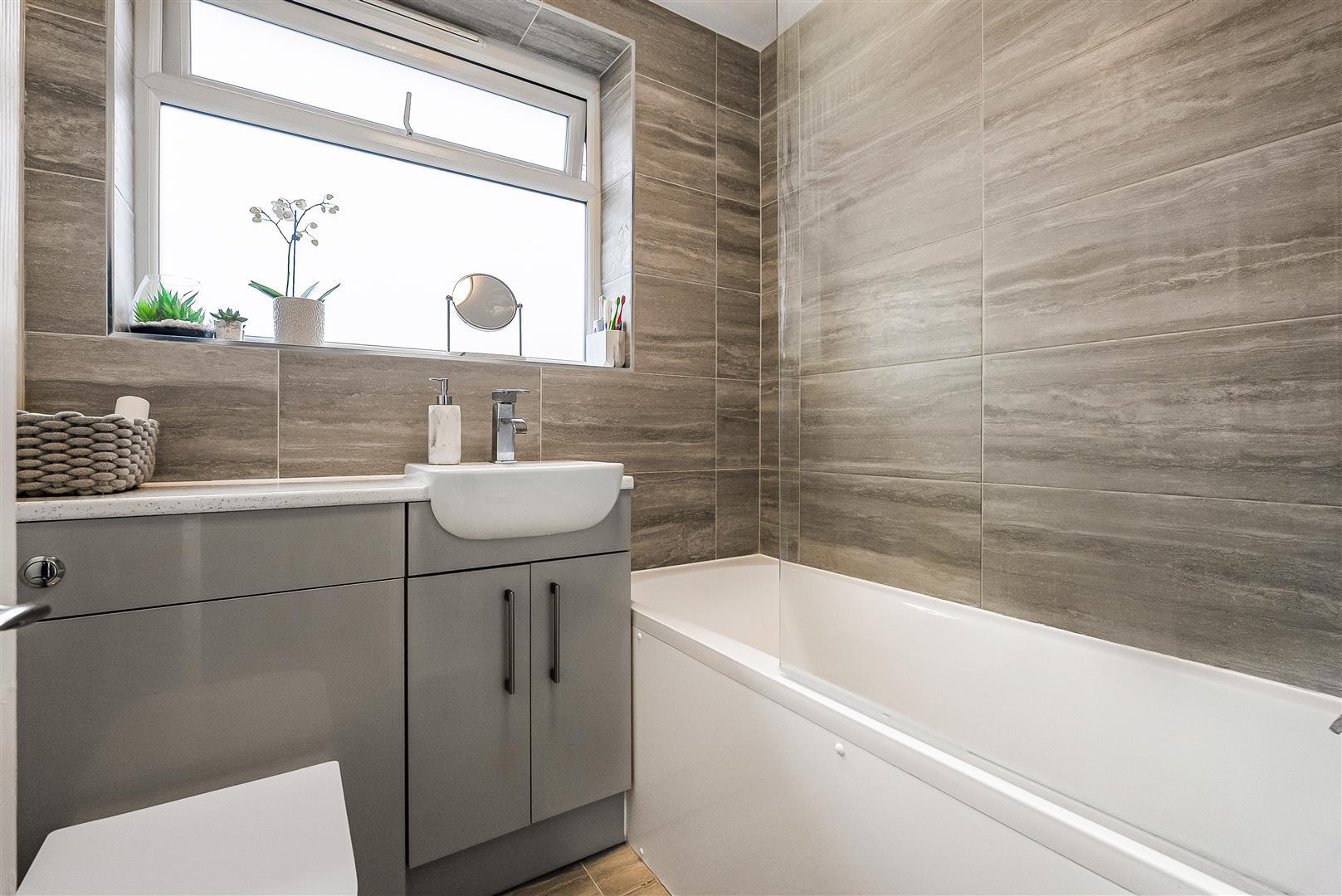 Refitted bathroom suite with bath and shower over, vanity unit with basin and WC.
