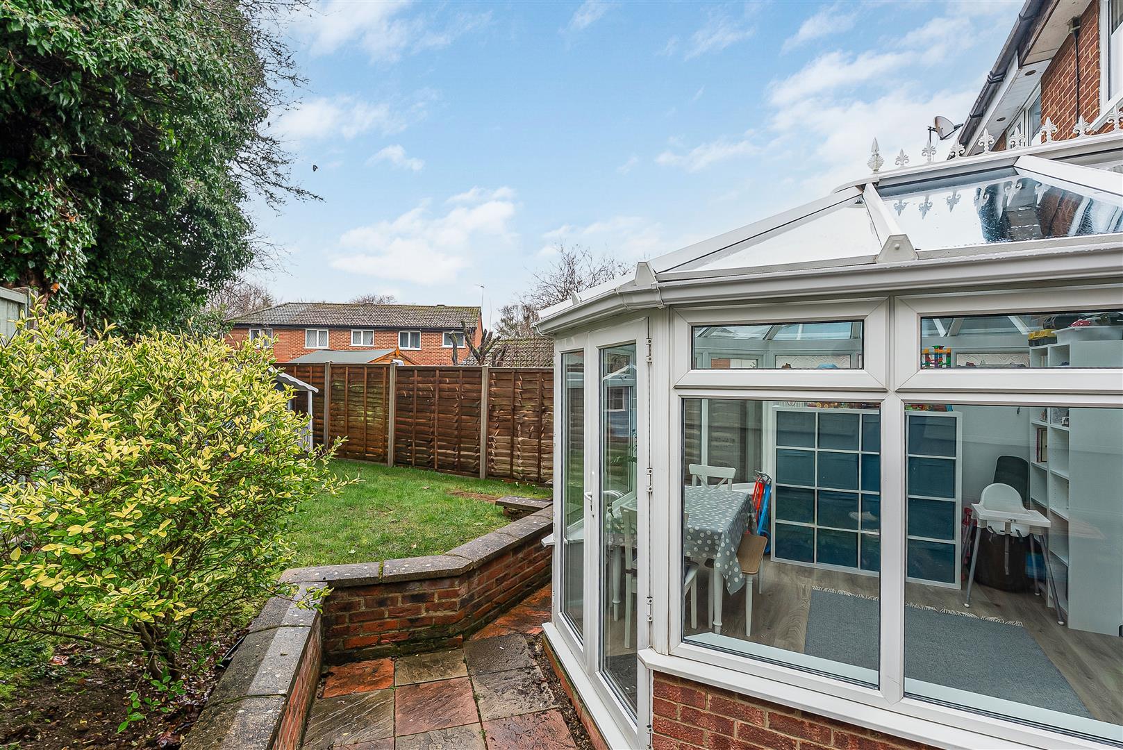 Driveway parking and one private parking bay. Pretty raised flower beds and lawn - gated side access through to;
