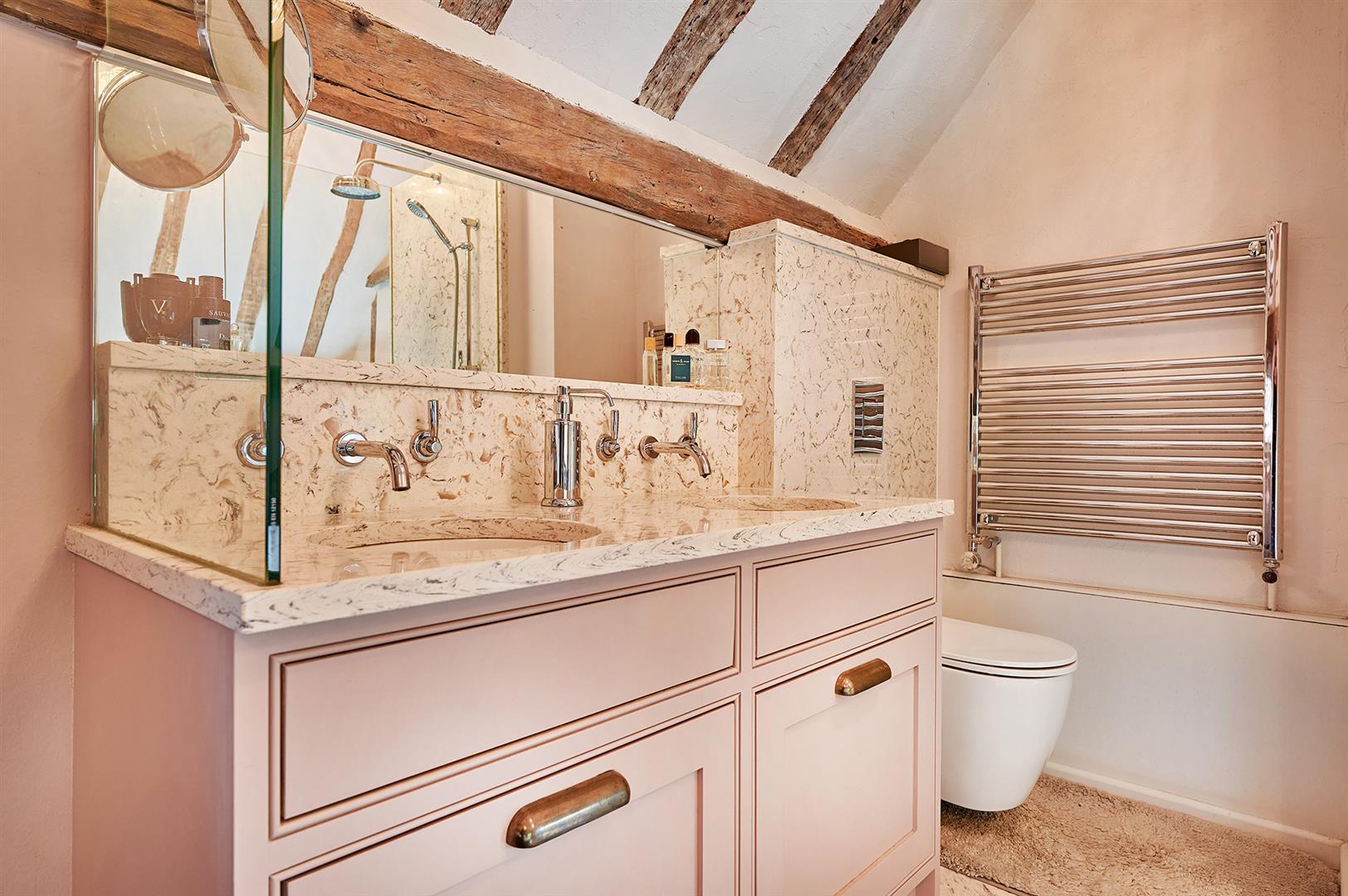Located to the rear of the bedroom is a large open plan en-suite area with luxury items including: Freestanding slipper bath with a tower mixer tap and hand shower attachment. Bespoke frameless, walk-in shower enclosure with a composite stone shower tray, overhead rain forest shower and a hand held attachment. WC with a concealed cistern. Twin inset Perrin & Rowe basins with wall mounted mixer taps and drawers below a quartz top. Chrome heated towel rail.