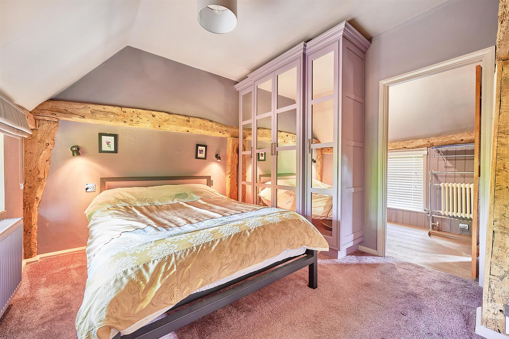 Multi-paned window to the front aspect. Radiator. Wealth of exposed timbers. Hatch to loft space. Two wall light points. Full-height mirror fronted wardrobe cupboard to one wall.