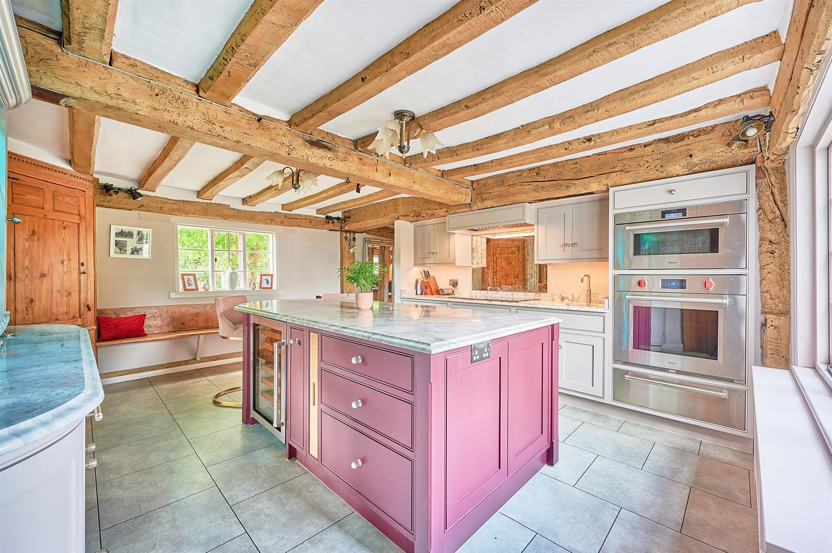 Other items in the room are: Antique corner cupboard, fitted bench seat, Amtico tiled floor, wealth of exposed timbers, multi-paned windows to the front and rear aspects. Radiator in an ornate enclosure,