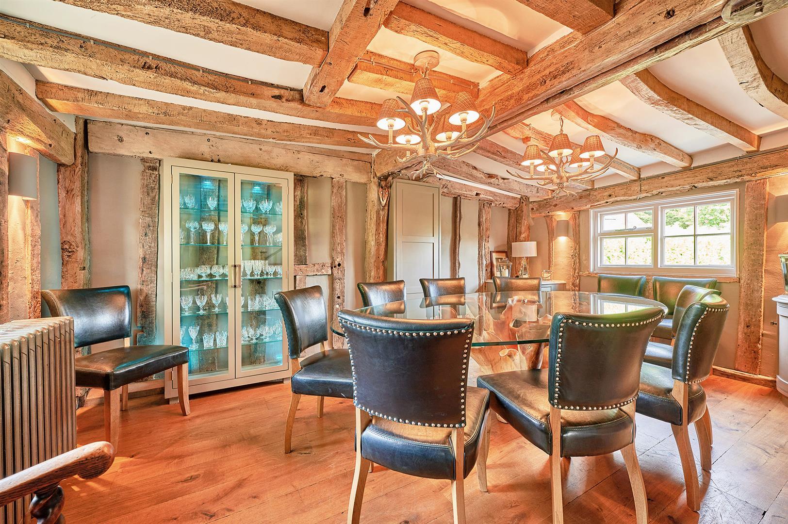 Wealth of exposed timbers. Original oak floor. Antique style radiators. Four wall light points and two ceiling mounted fittings. Full-height glass fronted display cabinet. Two corner storage cupboards with natural stone tops.