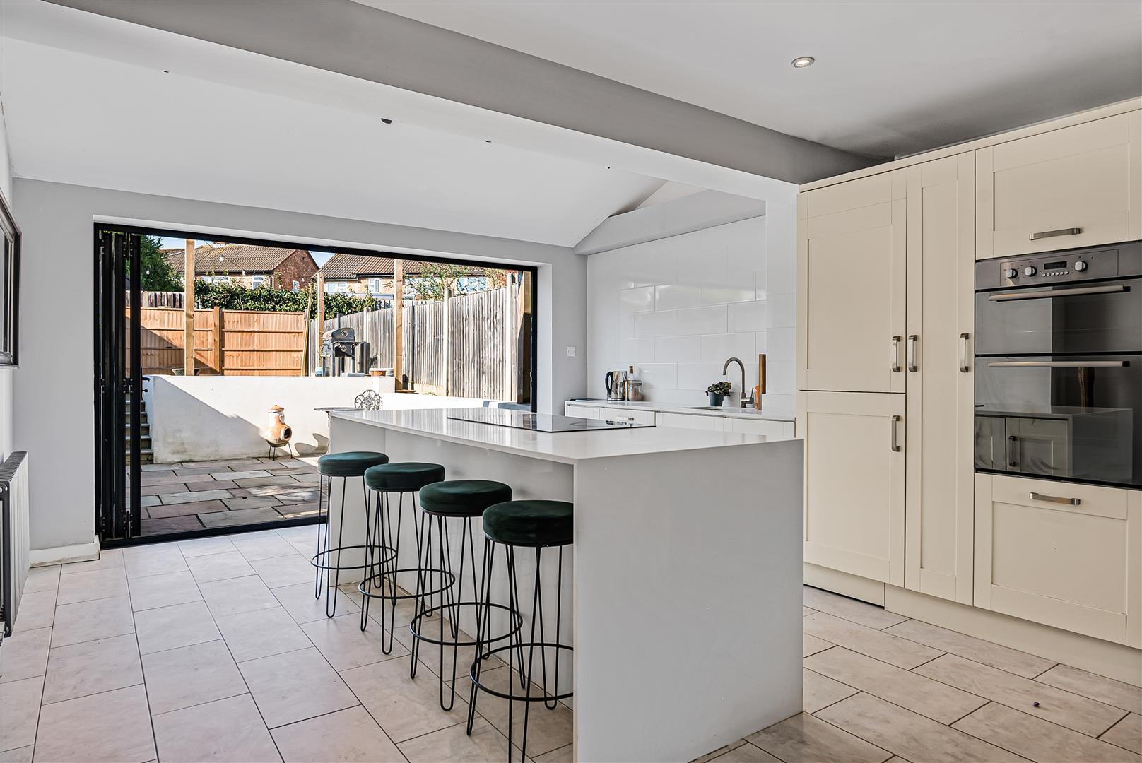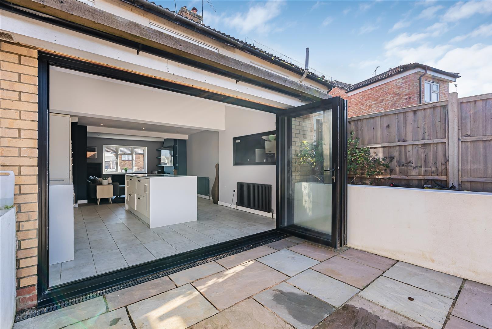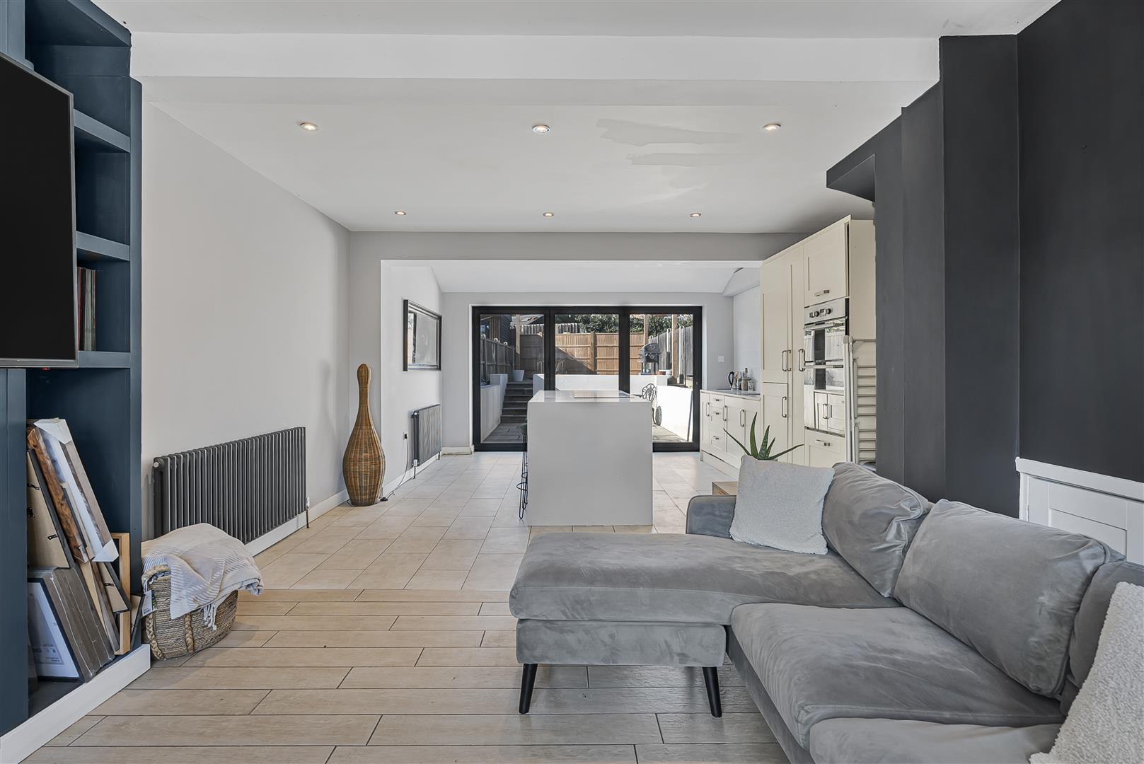 Large and bright living area with bi-fold doors to the rear and a fitted kitchen including;