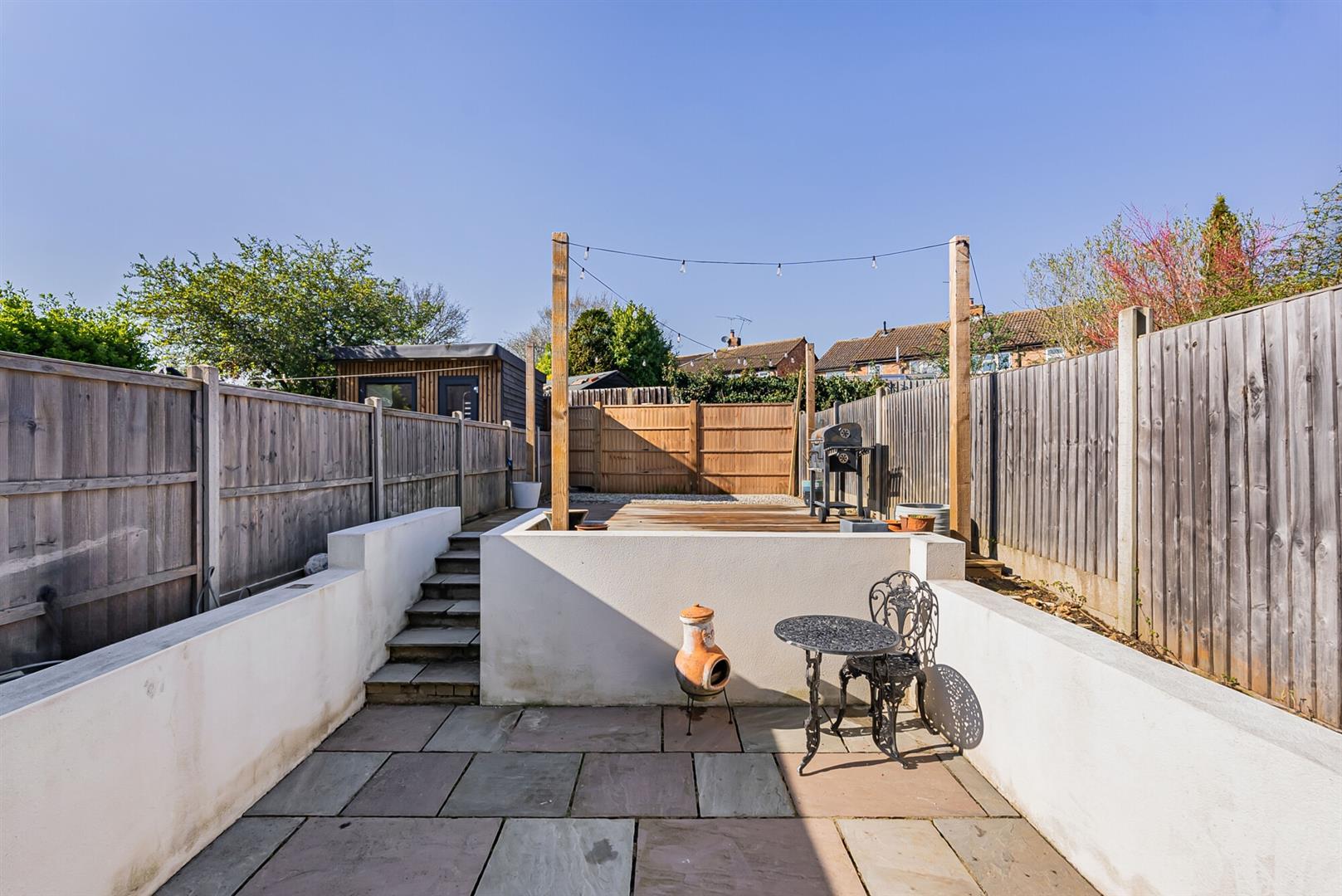 Spacious rear garden with a large patio and steps leading up to a further decked seating area. There is a base for a shed or outbuilding beyond.