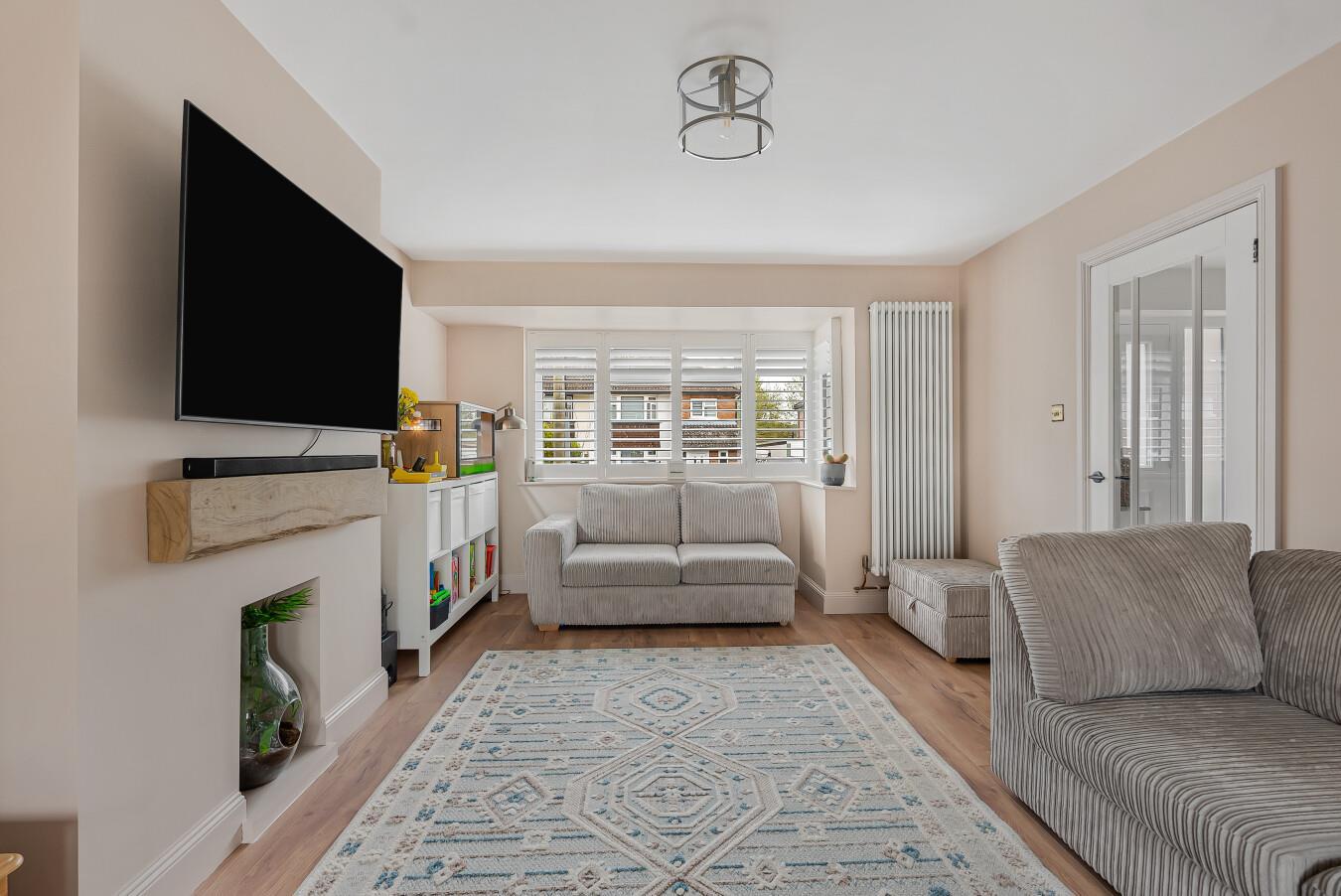 Wood effect laminate flooring. Feature vertical radiator. Two double fitted storage cupboards to one wall. Double glazed picture windows and French doors leading to the rear garden.