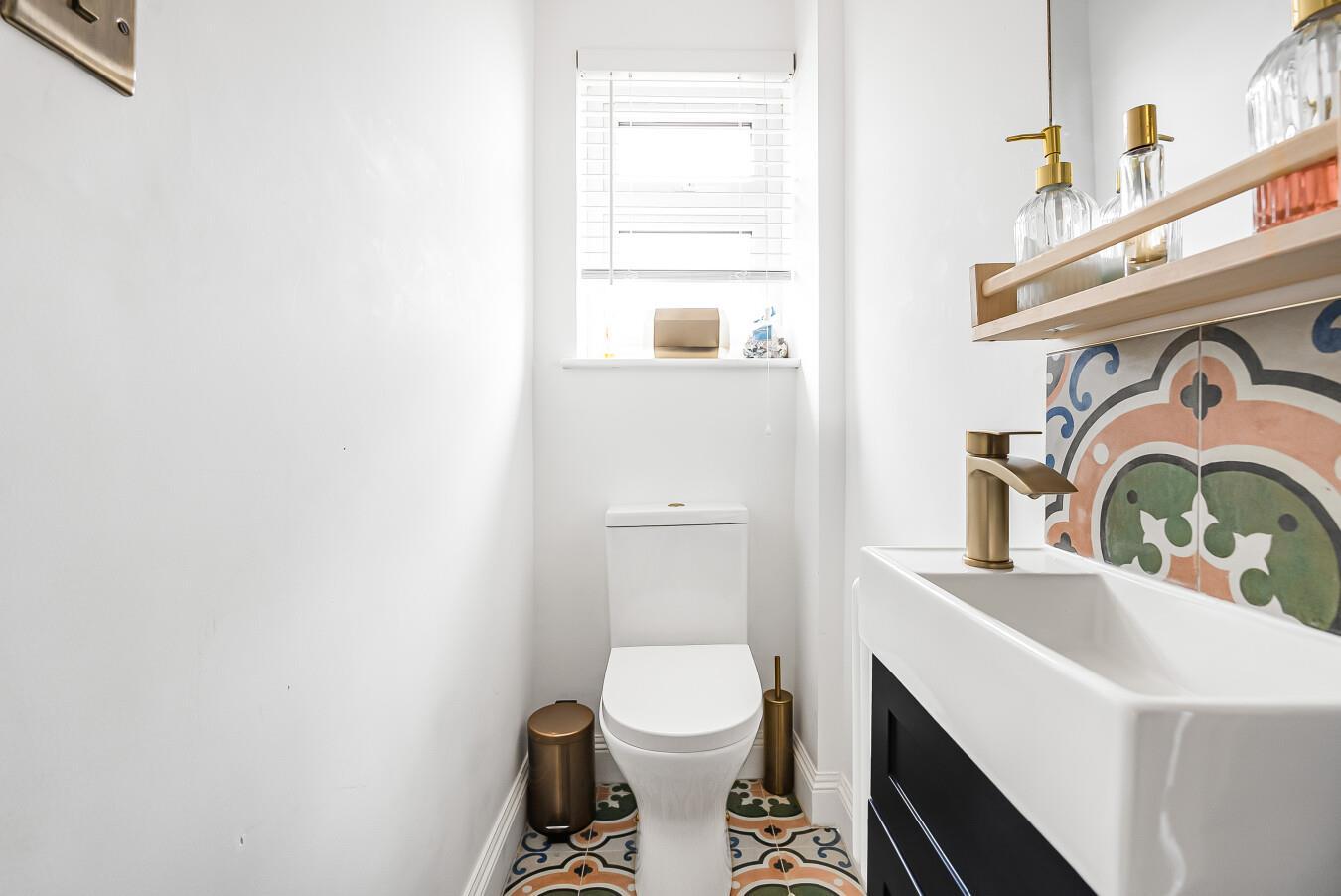Low level WV. Vanity unit wash basin with cupboard below. Double glazed window to the side. Antique style radiator. Ceramic tiled floor.