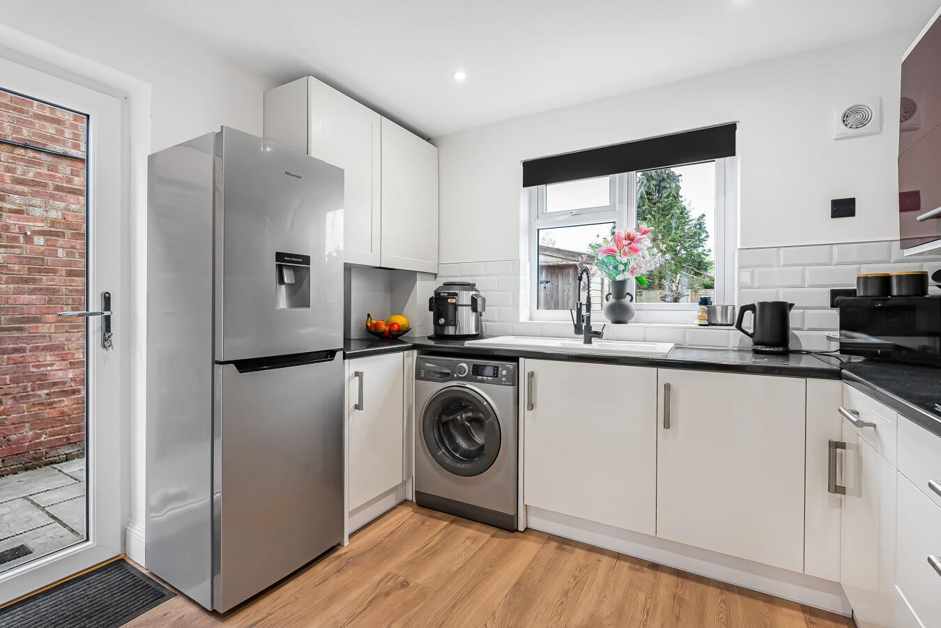 White inset single drainer, one and a half bowl sink unit with swan neck mixer tap which has a pull-out pan washing attachment and cupboards below. Adjacent work surfaces with cupboards and drawers below. Spaces for washing machine and upright fridge/freezer. Antique style radiator. Understairs cupboard with power connected and space for a tumble dryer. Three eye level wall cupboards. Cupboard housing Vaillant gas fired combination boiler. Extractor fan. Four inset ceiling lights. Wood effect laminate flooring. Ceramic tiled splashbacks to work surfaces. Double glazed window to the rear and door to the side.