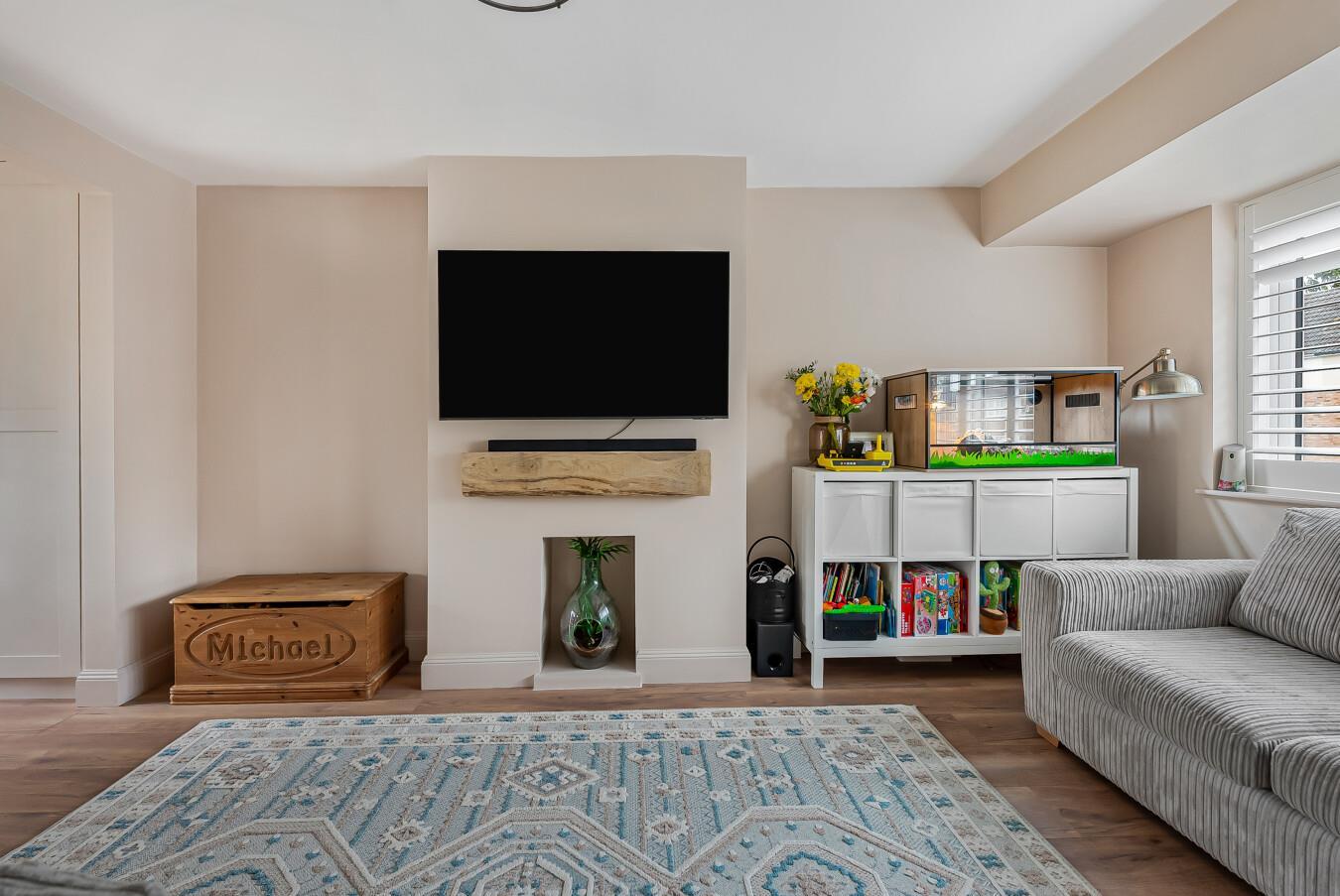 TV point. Wood effect laminate flooring. Feature vertical radiator. Arch to:
